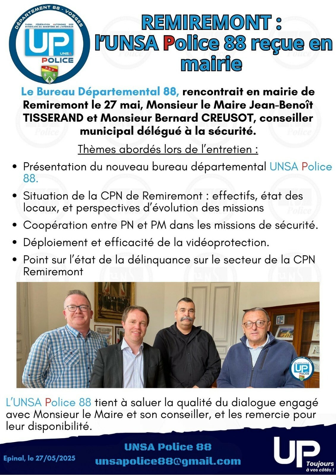 Dernière réunion studieuse avant des vacances bien méritées pour les principaux membres du bureau départemental de l’UD UNSA des Vosges. Cette réunion s’est déroulée en présence de Chloé Bourguignon, Secrétaire Régionale de l’UNSA Grand Est.
